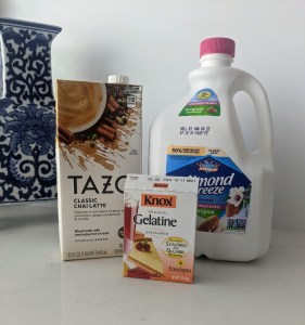Directions: Mix chai concentrate with almond milk. Boil one cup of mixture, and with the remaining cup, soften the gelatin. Combine and stir until gelatin is dissolved. Chill for three hours or until set.