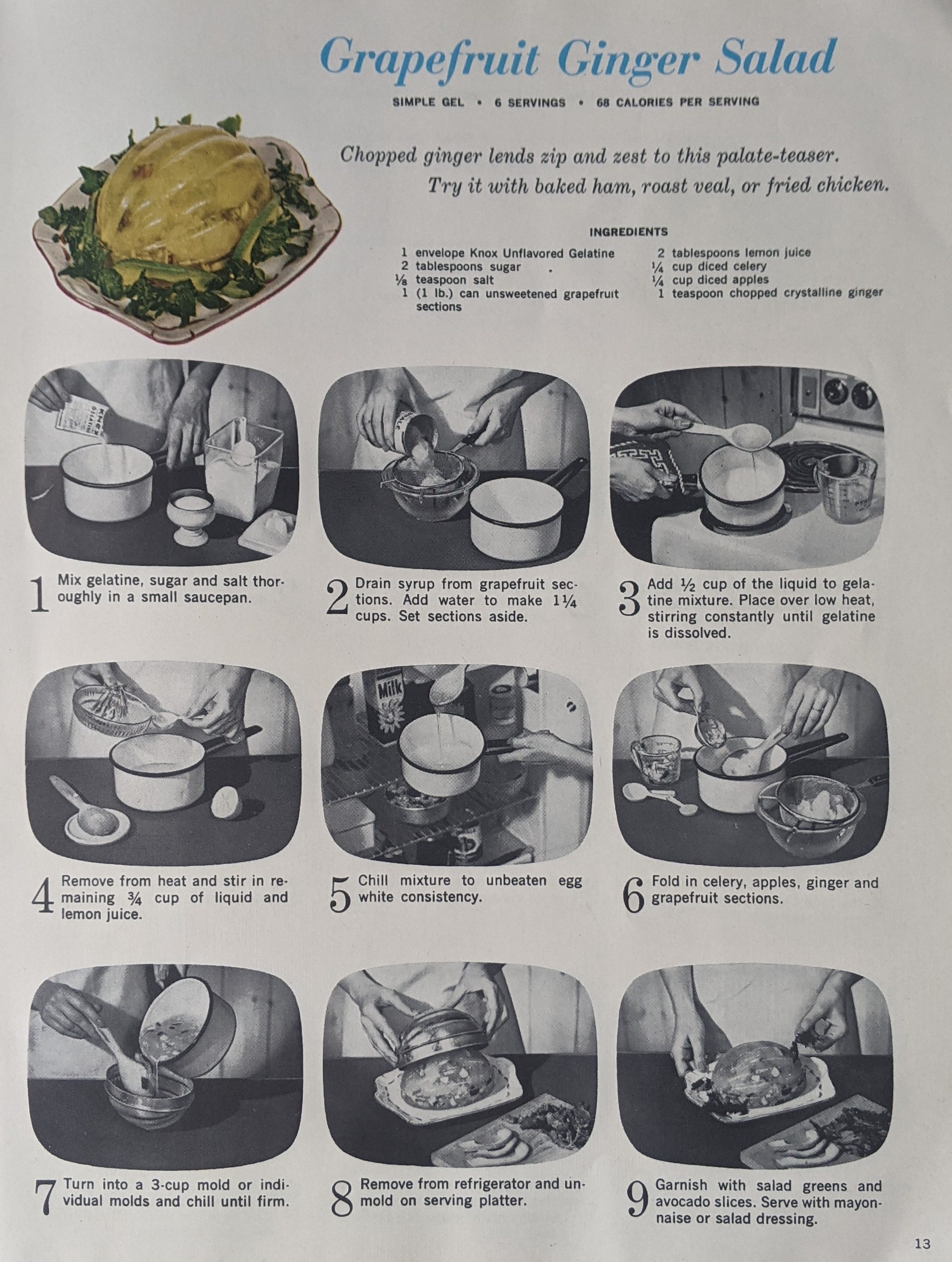 Brief History: The layout of Knox On-Camera Recipes is highly visual, complete with black and white photos alongside many of the recipe instructions.