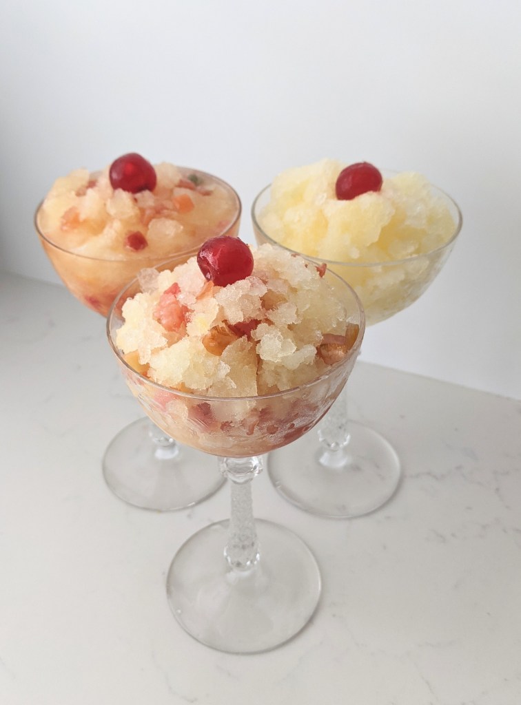 The flavor, too, is excellent. As my tasting team went back for seconds – without my prompting! – I did not think it necessary to change the amount or type of candied fruit in any way. We did determine that the candied fruit, while enjoyable, could be omitted to allow children or those who dislike the taste of sherry to enjoy the dessert, as the flavor of the granita is delightful on its own. If you are planning not to use the candied fruit, we recommend tasting the granita as you are making it so that you can adjust the flavor before the freezing process; you may want to increase the lemon juice to a full cup. We did, and we found that we liked the stronger flavor.
