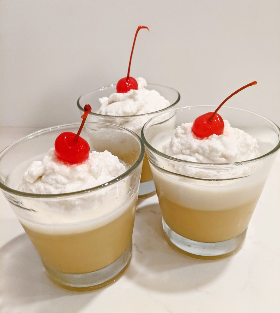 I also wanted to share a few comments about dairy-free alternatives, because I find that they can be difficult to use. For this recipe, it is imperative that the whipped cream be added to a fully-cooled custard. I’ve added a note about the addition of the whipping cream in the modified recipe to stress the importance of this step. If the custard is not fully cooled, the whipped cream will dissolve into the custard, only to separate from the custard during the settling process. This can disastrous if you are using a dairy-free whipping cream, as it can create a grainy, bland white top layer that is truly unpleasant. Not to worry, though! If this happens to you, simply remove it will a spoon before serving and cover the disturbed top with extra whipped cream and a festive cherry. With an understanding of the limitations of each dairy-free product, it’s possible to create a dessert that is very similar to the original.