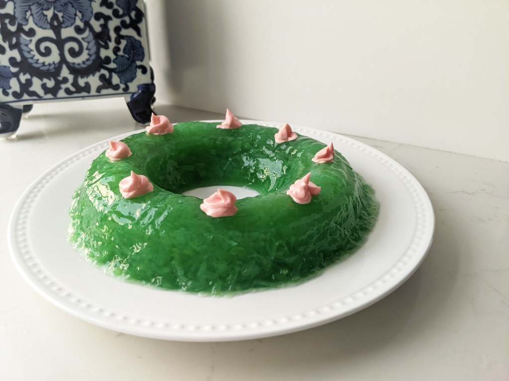 So, why the fuss? The predominant flavors of this salad are chicken stock and onion, which, by themselves, are not completely objectionable, but the addition of the softened cucumber creates a texture that is foreign to the modern palate. There’s also the element of an unwanted surprise. For those more familiar with sweet, brightly-colored gelatin deserts, the addition of food coloring to both the gelatin and mayonnaise might be considered deceptive. The savory taste is unexpected and therefore undesired.