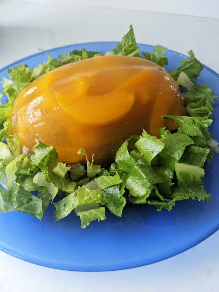 As for presentation, the color of this salad is beautiful! Be sure to use canned peaches in juice, not heavy syrup, and, if food textures can difficult for your guests or family members, I would recommend that the peach slices are halved before their addition to the gelatin mixture. It might also be pleasant to remove the peach slices entirely or serve them as a garnish.
