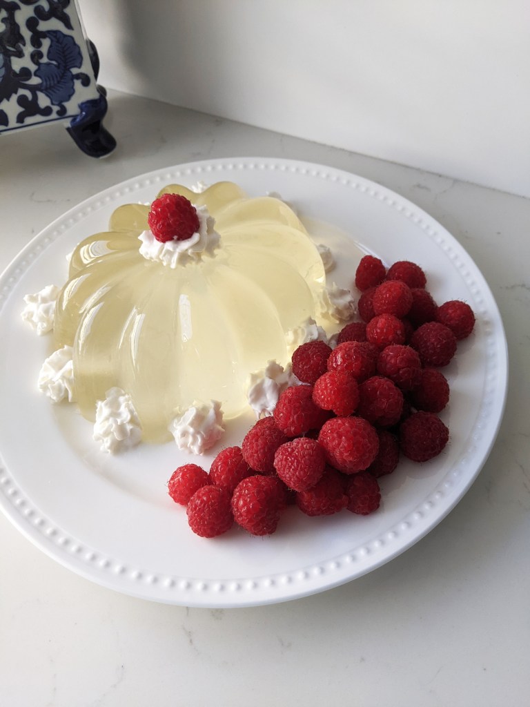 When garnishing this beauty, you may want to consider including a substantial amount of berries and whipped cream. I had a “happy accident” while plating the gelatin, which landed left of the plate’s center. To compensate, I piled much of the fruit to one side, adding more raspberries than I had originally thought to include. This addition was popular with my tasters, who enjoyed the raspberries both with and without the gelatin.